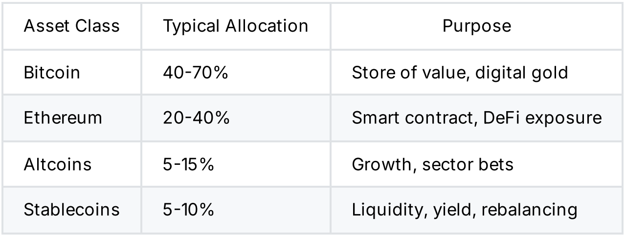 Core Holdings: Bitcoin (BTC) as a store of value. Ethereum (ETH) for exposure to smart contracts, DeFi, and Web3 innovation.